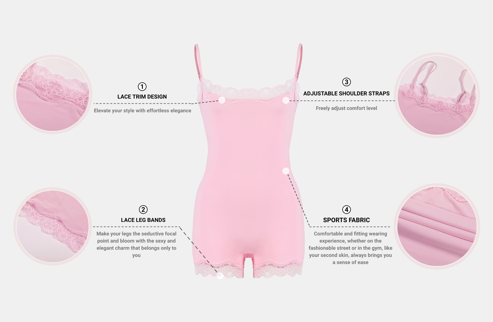 - Lace Neckline and Leg Bands: The intricate lace neckline adds a touch of femininity and charm, while the lace leg bands give a unique and sexy detail, making you stand out.